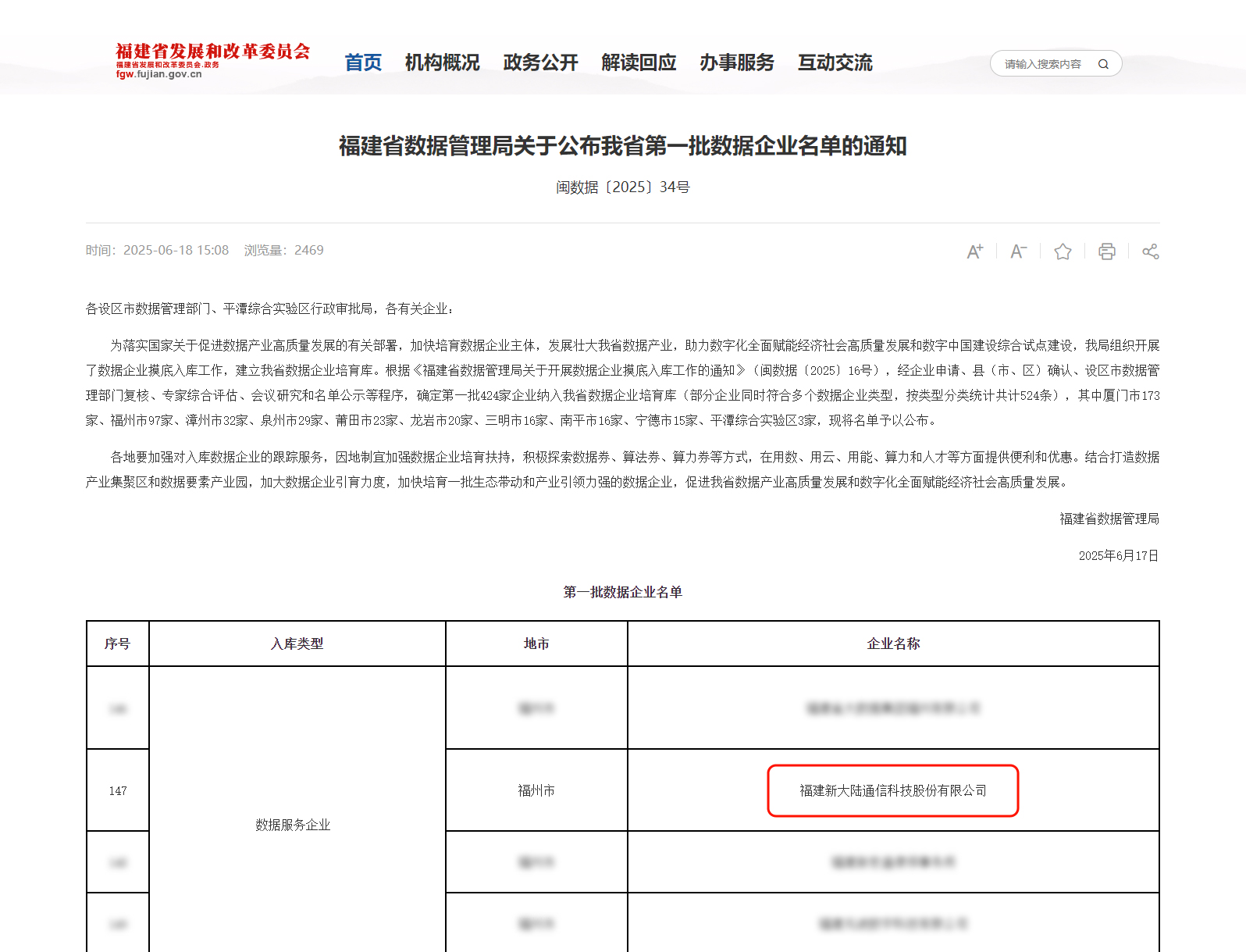 近日,福建省數據管理局公布我省第一批數據企業名單,新大陸憑借在數據服務領域的專業實力與服務實踐成功入選,彰顯其作為數據企業的代表性、創新性與發展潛力。